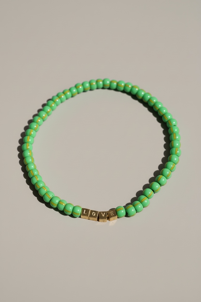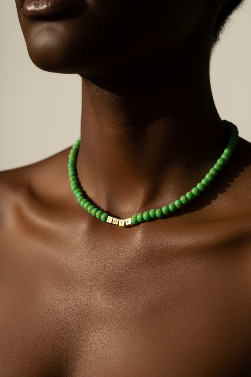 The LOVE Necklace is a celebration of meaning and hand craft. Each letter is individually engraved on a golden cube, forming a quiet statement of intention. Finished with authentic West African beads, every piece carries a sense of heritage, warmth, and story.